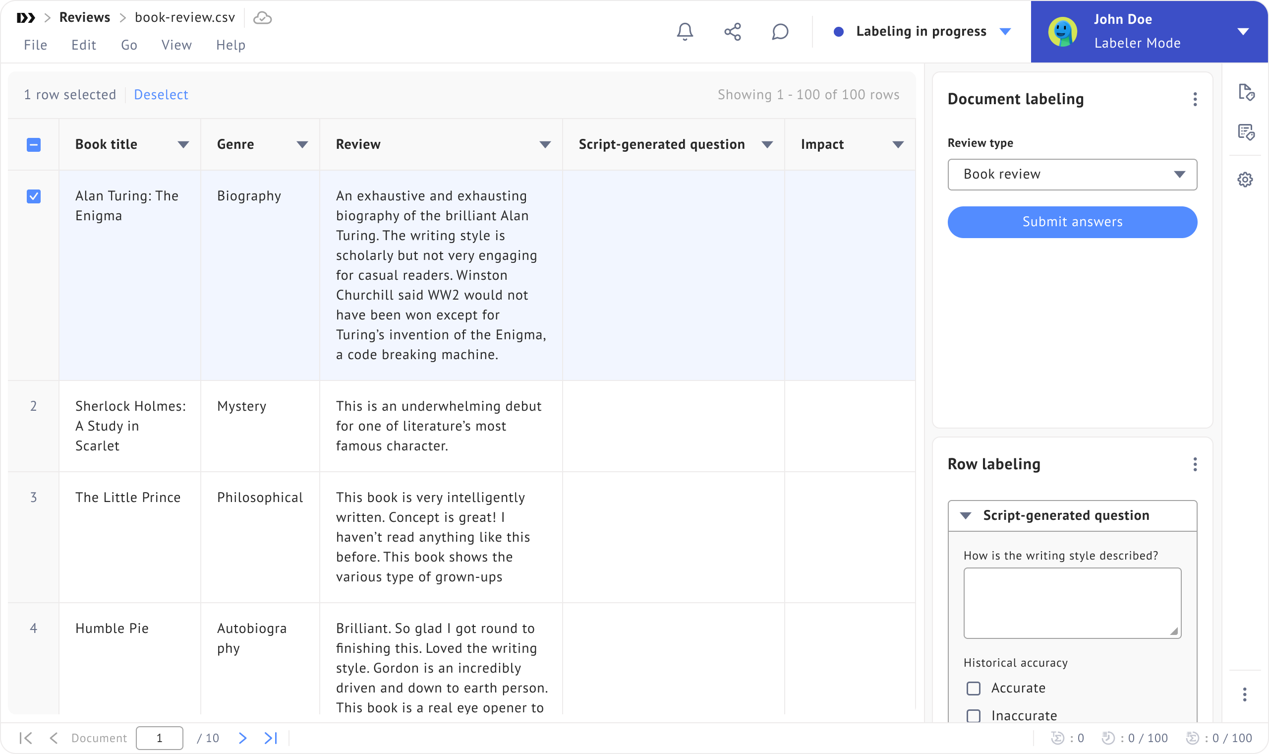 You can now mix span + row + document labeling in one workflow. This means you can annotate entities within text (span), answer multiple questions for each line and for each document, all without switching between projects.