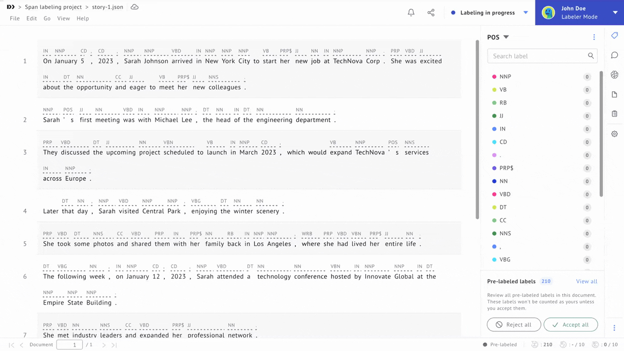 When “Require approval for pre-labeled labels” is enabled, users can now view a dedicated list of pre-labeled labels and accept or reject them individually or in bulk via the Labels extension, keeping quality checks fast and explicit even when working with large volumes of pre-labeled data.