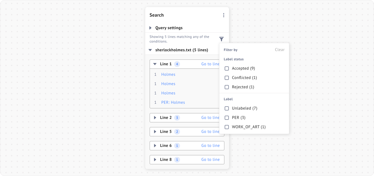The Search Extension in Span Labeling now includes additional filtering options, allowing users to refine search results by label status and quickly narrow in on labels that need review or verification.