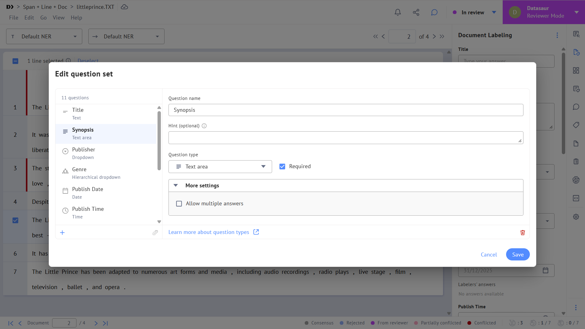 You can now combine span, line, and document labeling in a single project. This hybrid setup is especially useful for complex documents like contracts, transcripts, or research papers where you may need to label at multiple levels. With this new project type, you can manage everything in one place without having to configure multiple projects just to annotate the exact same data.