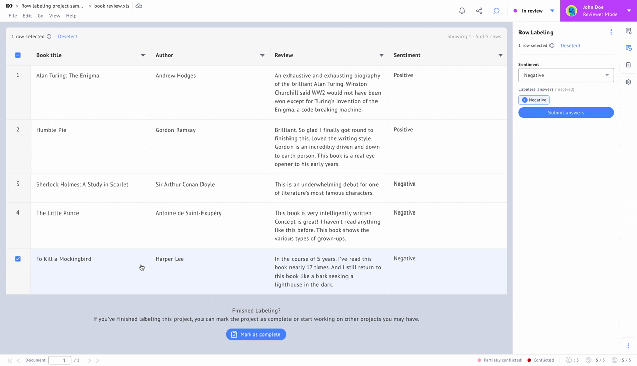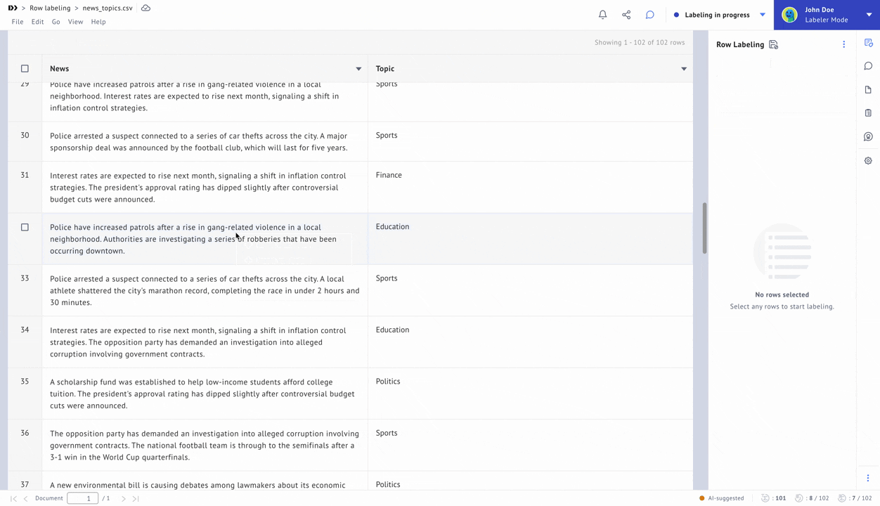 In Row Labeling projects, multiple row selection is now available in both Labeler and Reviewer modes. Previously, this feature was limited to Labeler Mode, but with Reviewer support added, you can now efficiently review, approve, or edit several rows at once, making bulk actions faster and more consistent across workflows.